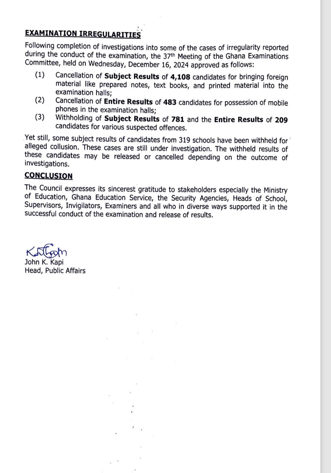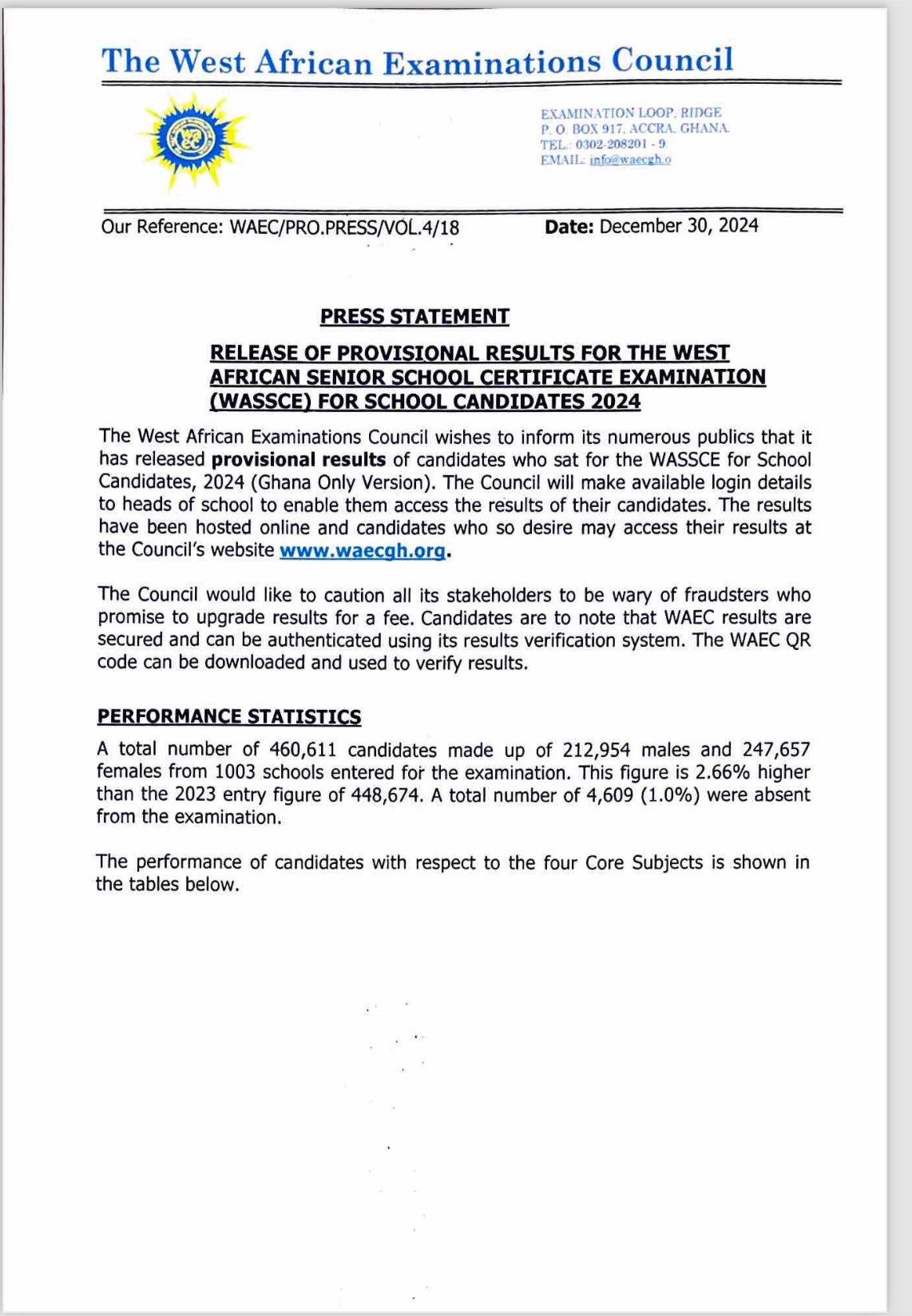 The West African Examination Council (WAEC) has announced the release of the 2024 WASSCE Results. In a letter released on the mid-day of Monday, 30th December, 2024, stated that the results for 460,611 students have been released.